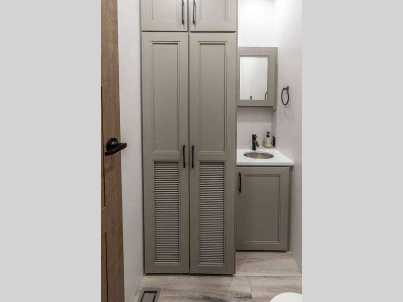 Sleeps 4 Slides 4 Length 34 ft 11 in Ext Width 8 ft 5 in Ext Height 13 ft 6 in Int Height 6 ft 8 in Interior Color Mink, Pebble Exterior Color Black Pearl Full Body Paint Option Hitch Weight 2650 lbs GVWR 14995 lbs Dry Weight 12170 lbs Cargo Capacity 2825 lbs Fresh Water Capacity 76 gals Grey Water Capacity 90 gals Black Water Capacity 50 gals Tire Size 17.5" Furnace BTU 40000 btu Available Beds King Refrigerator Type House Refrigerator with 2000W Inverter Refrigerator Size 26 cu ft Convection Cooking Yes Cooktop Burners 4 Shower Size 48" x 30" Number of Awnings 1 Axle Weight 9520 lbs LP Tank Capacity 30 lbs Water Heater Type On Demand Tankless AC BTU 45000 btu TV Info LR 50" Smart LED TV, BR 32" Smart LED TV Awning Info 17' Electric w/LED Light Strip Axle Count 2 Washer/Dryer Available Yes Number of LP Tanks 2 Shower Type Shower w/Seat Electrical Service 50 amp Similar Floorplans