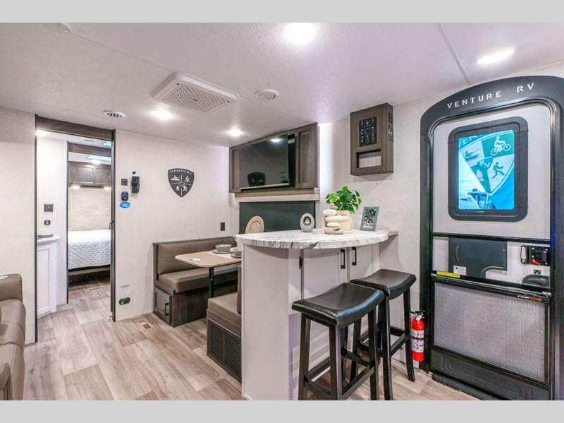 The Venture RV Stratus travel trailers have it all! From an eye-catching exterior to stunning interior décor, a significant amount of storage, and a long list of handy features. They even have clever concealed spaces for organization that is out of sight like the storage bins under the dinette.