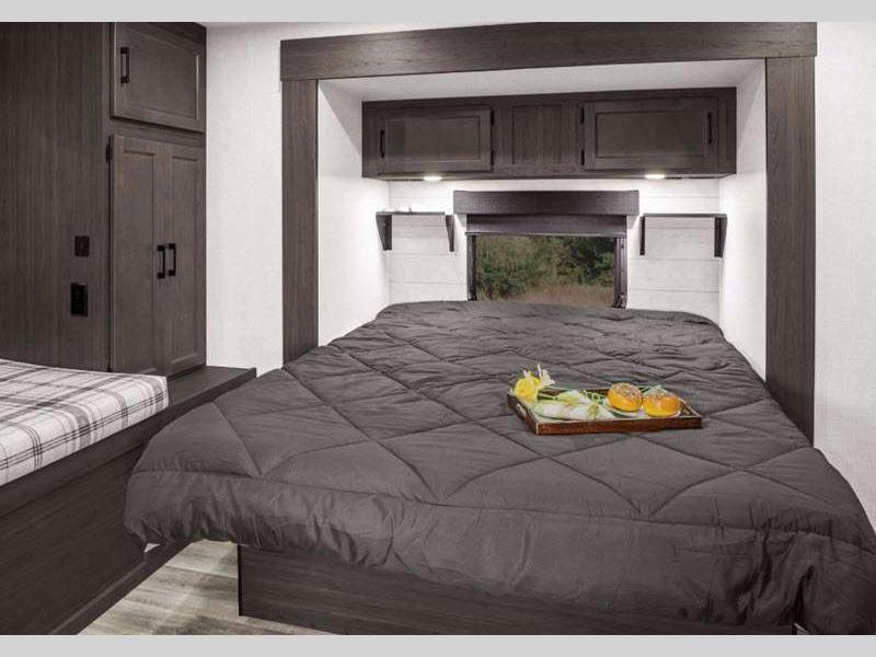 Sleeps 8 Slides 1 Length 33 ft 11 in Ext Width 8 ft Ext Height 11 ft Int Height 6 ft 6 in Interior Color Chestnut, Fawn, Sufside Maple, Teak Exterior Color Arctic White (Standard), Aztec Grey Hitch Weight 860 lbs GVWR 9290 lbs Dry Weight 6950 lbs Cargo Capacity 2340 lbs Fresh Water Capacity 45 gals Grey Water Capacity 32 gals Black Water Capacity 32 gals Tire Size 15" Furnace BTU 30000 btu Number Of Bunks 4 Available Beds Queen Refrigerator Type 12V Refrigerator Size 10 cu ft Cooktop Burners 3 Shower Size 30" x 36" Number of Awnings 1 Axle Weight 6090 lbs LP Tank Capacity 20 lbs Water Heater Type Tankless TV Info LR 40" Smart TV Awning Info 20' Axle Count 2 Number of LP Tanks 2 Shower Type Standard Similar Floorplans