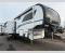 This fifth wheel’s rear kitchen is a culinary paradise, boasting large countertop space for effortless meal preparation, a three-burner range and oven for versatile cooking, a microwave for swift heating, and a pantry for ample food storage. Additionally, the French door refrigerator provides ample storage for fresh ingredients and beverages. Adjacent to the kitchen, a sleek legless table with four chairs provides an elegant and flexible dining space. The living room is a refined retreat featuring theater seating, a hide-a-bed sofa, and a fireplace paired with a TV creates a cozy ambiance. The full bathroom is a sanctuary of comfort, offering a well-appointed space for personal care and hygiene. Finally, the front bedroom, an elegant oasis, features a king bed for luxurious rest, a spacious wardrobe for clothing storage, and a dresser for added organization.